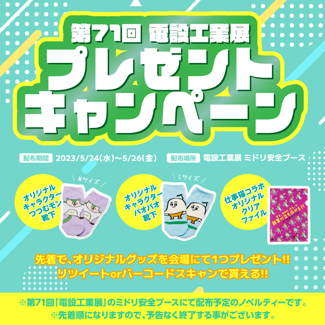 弊社ブースにお越しいただいたお客様へ、名刺交換・入場者バーコード読み取り・キャンペーン投稿をリツイートいずれかでノベルティを差し上げます。特にミドリ安全70周年記念 仕事猫コラボメモ帳・ステッカーは周年終わり間近につき入手できる数少ない機会です。是非お立ち寄りください。(配布予定個数がなくなり次第終了)
