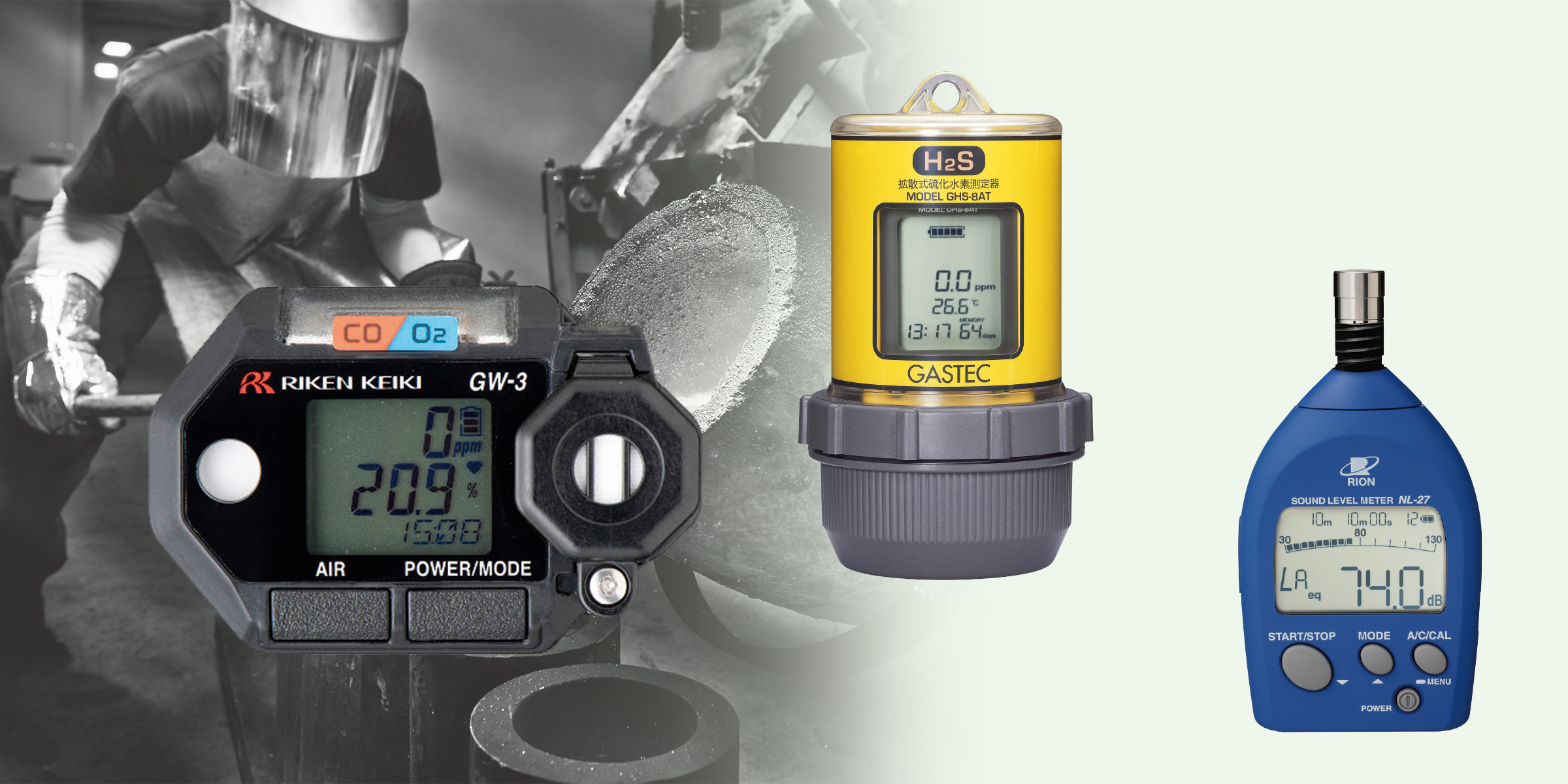 作業環境における労働者の健康を守るには、有害物質や有害エネルギーなどを労働者に暴露させないことが必要です。人体に影響のある酸素・硫化水素・一酸化炭素・可燃性ガスを検知するガス検知器をはじめ、職場の環境を判断する為に必須の熱中症指標計や粉じん計、騒音計、風速計など、多様な現場のリスクを知り、回避するために検知警報器・作業環境測定器がお役に立ちます。